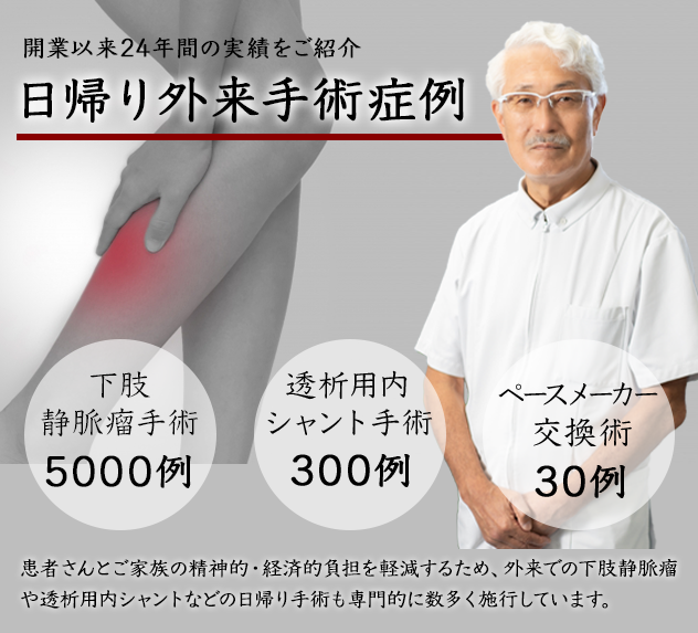 虚血性心疾患(狭心症・心筋梗塞),弁膜症,不整脈,血管疾患(閉塞性動脈硬化症・バージャー氏病・下肢静脈瘤・静脈血栓症)などの心血管疾患全般お よび高血圧,高脂血症,糖尿病,肥満などの生活習慣病を多く診療し、禁煙外来も行っています。 また外来での下肢静脈瘤や透析用内シャントなどの日帰り手術も専門的に数多く施行しています。